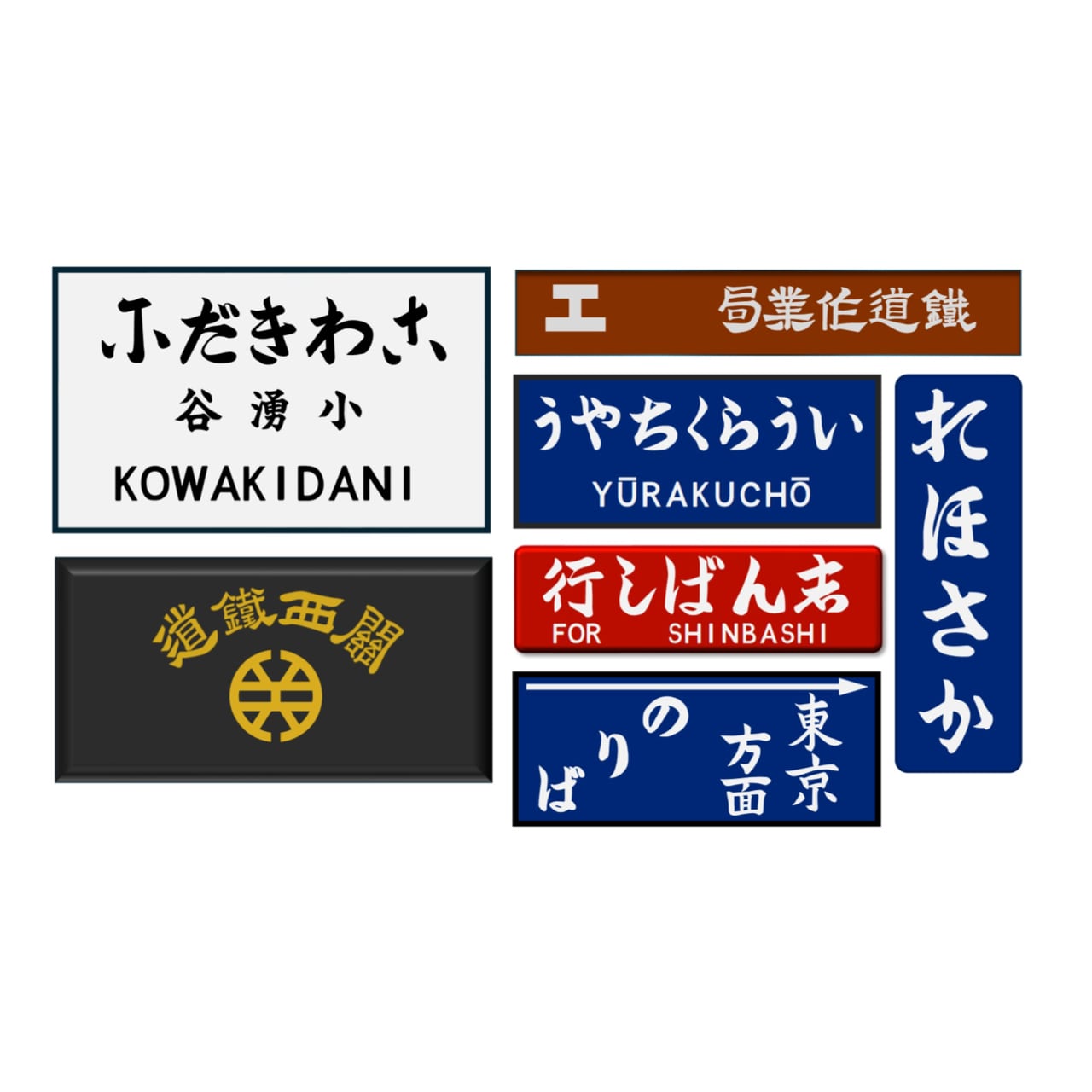平仮名五十音(一部の仮名は二種類)+変体仮名+漢字7字+アルファベット26字+O、Uのマクロン(長音記号)つき+オマケ(私設鉄道社紋や標記)16字